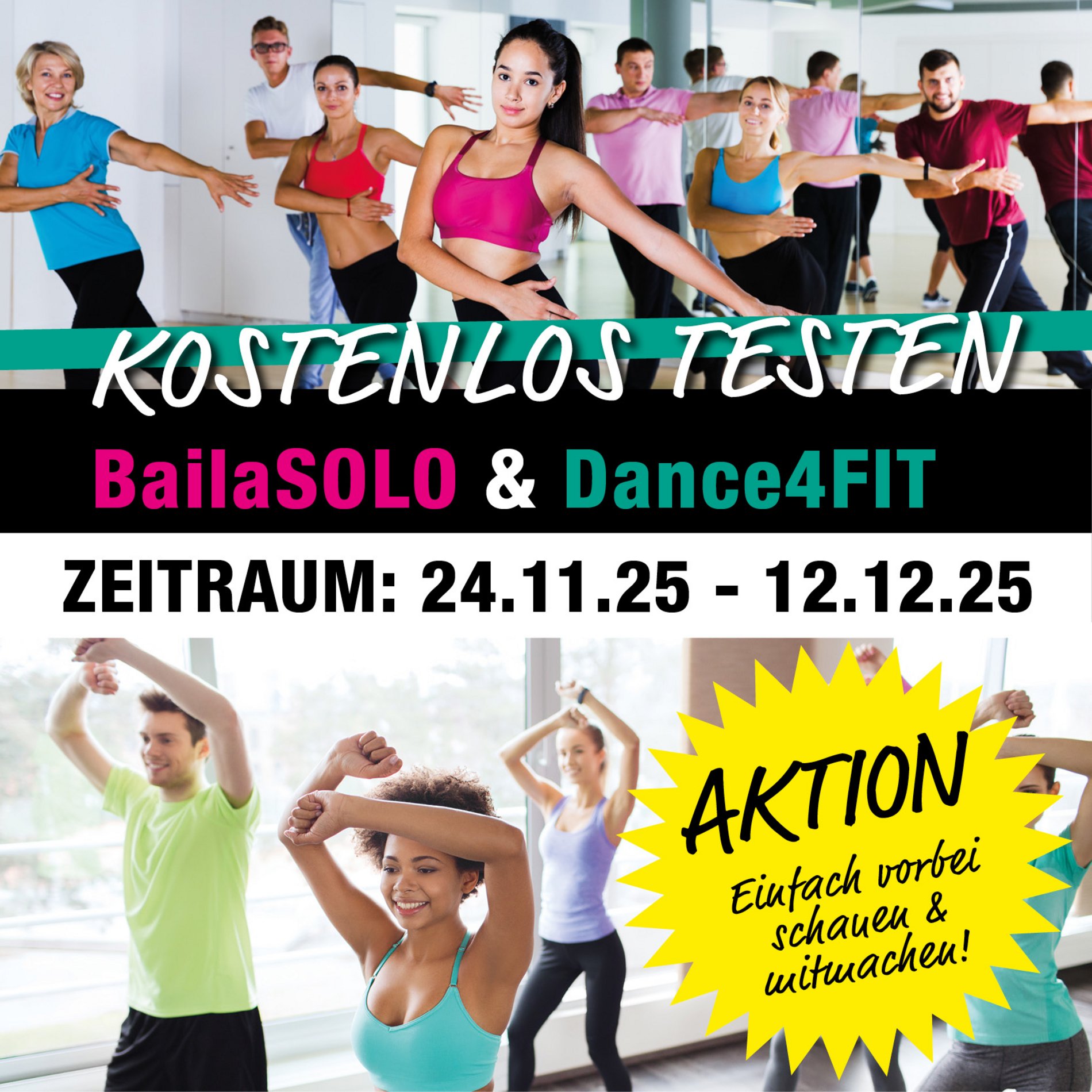 Für alle die sich nicht zwischen BailaSolo und Dance4fit entscheiden können aber beides für sich nutzen wollen, um fit zu bleiben bieten wir natürlich die Möglichkeit beides kombiniert zu besuchen zu einem Kombipreis.